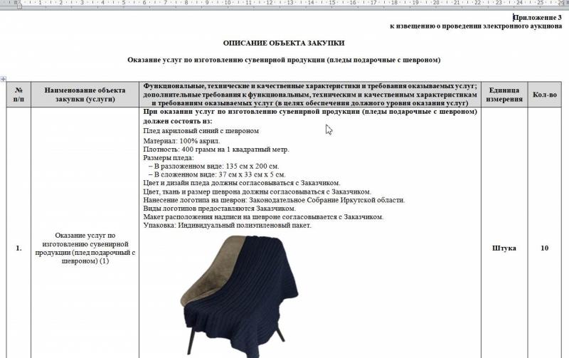 Приготовили и десять штук пледов – видно, для самых дорогих одаряемых. Но и тут все скромно. Не кашемир какой-нибудь, а 100-процентный акрил. Начальная цена в 93 666 рублей снизилась до 46 832 рублей. То есть всего за неполные пять тысяч рублей на каждого парламентский Дедушка Мороз принесет десяти каким-то больше всего отличившимся в глазах Заксобрания гражданам пледы с шевроном с его логотипом!