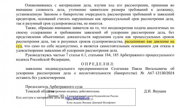 И вот тут начинается самое интересное. Пока людям говорят, что денег нет, в телеграм-каналах вовсю обвиняют Томский арбитражный суд в умышленном затягивании дела. Автор телеграм-канала «ТОМСК ВАЖНОЕ» прямо заявляет: судьи помогли «жуликам» вывести активы. По данным канала, ещё в марте этого года в ускорении дела по АНПЗ отказал суд, где обязанности председателя исполняла Наталья Ерёмина. Позже её шеф, председатель Дмитрий Янущик, отказал банку в ускорении, заявив, что «соблюдение процессуальных сроков не является самостоятельной целью судопроизводства».