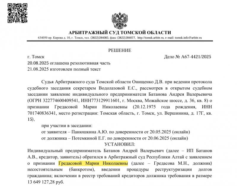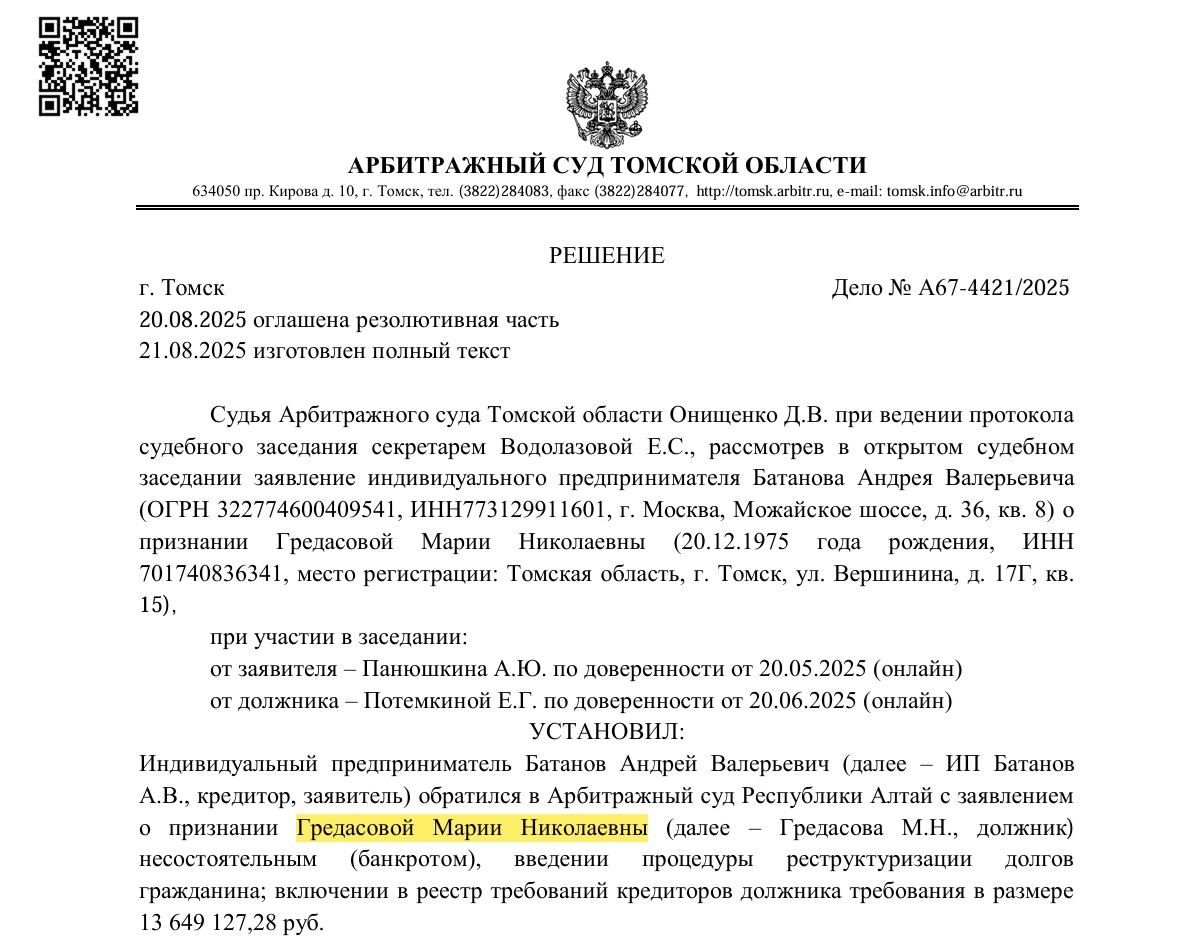 Вишенкой на торте стало личное банкротство самой Марии Гредасовой. Пока её миллиардные компании тонули в исках, она, как считает «ТОМСК ВАЖНОЕ», провернула «договорнячок». 20 августа 2025 года суд стремительно признал её банкротом по иску от частного предпринимателя на «смешные» 13 миллионов рублей. Где в этом деле банк с его 1,4 миллиардами — вопрос риторический. Тот же канал утверждает, что Гредасова, уже будучи банкротом, пересекла границу РФ и из-за рубежа продолжает прятать активы от кредиторов.