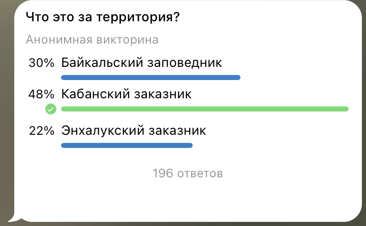 Телеграм-канал «Бурятия. Бабр. Дальше некуда» предложил читателям угадать, о какой природной территории идёт речь. Большая часть опрошенных (48 %) угадала, что это Кабанский заказник.