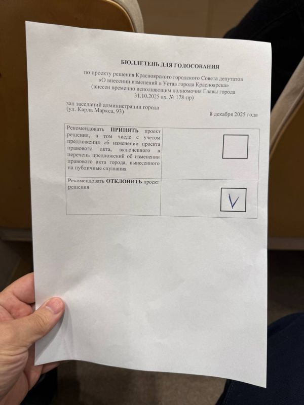 – Никто не подумал о том, что, если будет только один участник, который очевидно настроен против этого устава, результат публичных слушаний будет единогласно против. Никто не позвал каких-нибудь своих заместителей, водителей для того, чтобы паритет голосов был хотя бы 10/1 или 15/1, чтобы показать, что есть красноярцы, которые работают в администрации и проголосовали «за» устав, а есть городской сумасшедший, который проголосовал «против» – нет. Я голосовал один и, более того, выступал в администрации города, озвучив свою позицию аргументировано. И знаете, что еще самое интересное: никто из присутствующих не выступил «за», комиссия просто проголосовала и вынесла его на заседание городского совета», – рассказал Аксютенко о своем участии в публичных слушаниях.