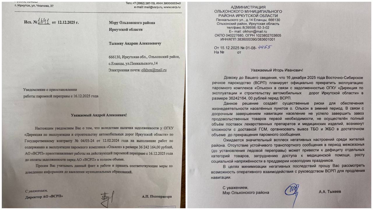 Мэр Ольхонского района Андрей Тыхеев «взорвал» информационную повестку, опубликовав официальное уведомление от Восточно-Сибирского речного пароходства (ВСРП) на своем Telegram-канале. В документе, направленном в администрацию, перевозчик извещал, что с 16 декабря навигация парома на остров Ольхон будет прекращена. Причина – задолженность государственного казенного учреждения «Дирекция по эксплуатации и строительству автомобильных дорог Иркутской области» за работы по содержанию переправы. Сумма долга – 36,2 миллиона рублей.