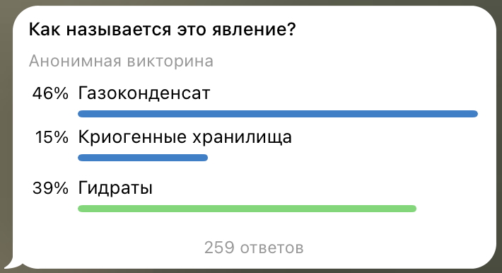 Телеграм-канал «Бурятия. Бабр. Дальше некуда» предложил читателям угадать, как эти кристаллы называются. 39% опрошенных угадали, что это гидраты, а вернее, газовые гидраты.