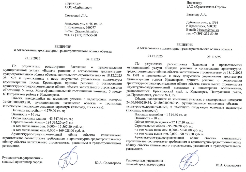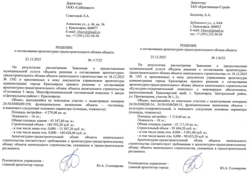 А теперь мы узнали, что рядом с гостиницей будет ещё одно здание. Смотрите последнее фото: зелёный контур — это участок под гостиницу, а жёлтый — это участок под «культурно-оздоровительный комплекс». В ушедшем 2025 году Баталов приобрёл компанию, которая с 2008 года арендует этот жёлтый участок у города. Договор аренды истекает в 2028 году, но если начнётся стройка, то договор можно будет продлить.