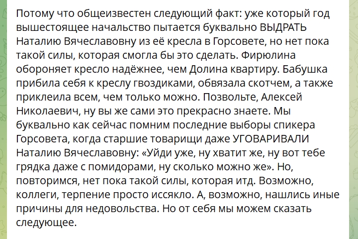 В своей нетривиальной манере ответил на этот спич «А вы точно сибирский политолог?» Тезисы Аксютенко стали для канала удивительными. То, что пишут про Наталию Вячеславовну, далеко от терминов «пинают» и «издеваются». Это лёгкий флёр критики. И то, что Фирюлина может уйти по приказу, в корне не так.