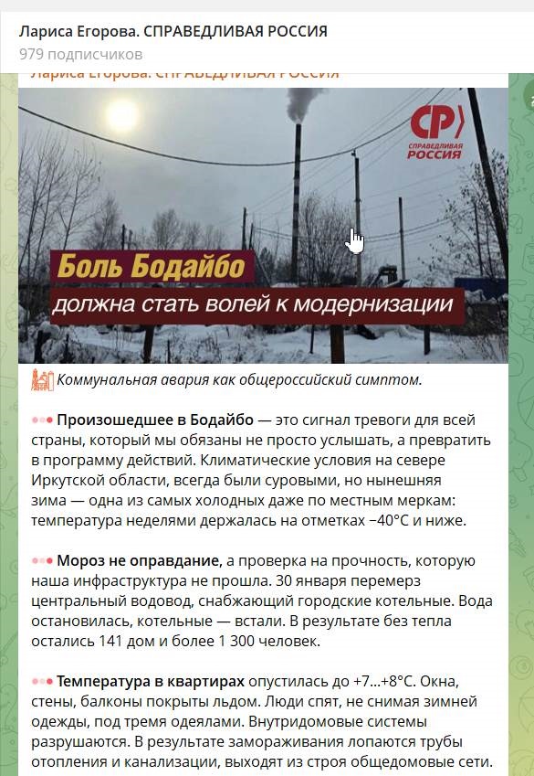 В канале Ларисы Егоровой, который замещает собой в Телеграме всю региональную «Справедливую Россию», только написанное без души изложение всем известных фактов да призыв в стиле «Нет худа без добра». Негусто.