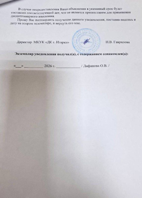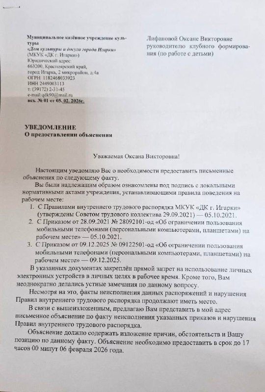 Однако на этом претензии и давление главы Игарки не закончились. В начале февраля Алексей Аксютенко сообщил новые подробности, связанные с предстоящим судебным процессом. По его информации, Оксана Лифанова получила от руководства Игарского ДК требование о предоставлении письменных объяснений по факту нарушений правил поведения на рабочем месте.