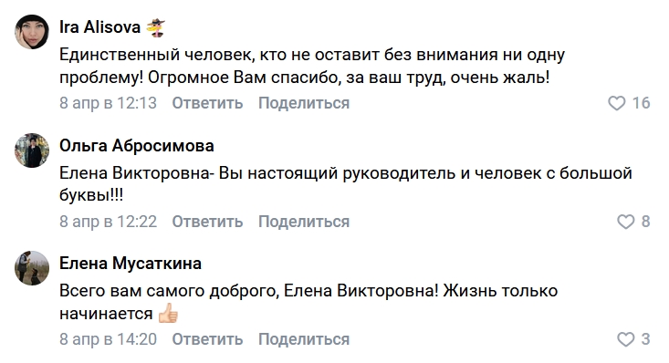 В комментариях подписчики благодарят Ланину за её работу и жалеют, что она уходит с должности.