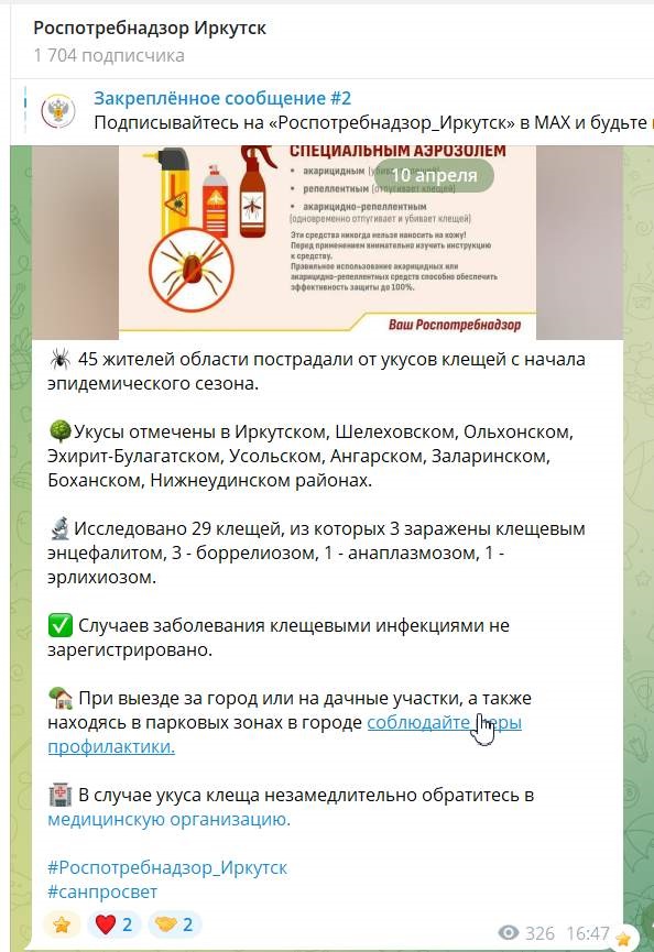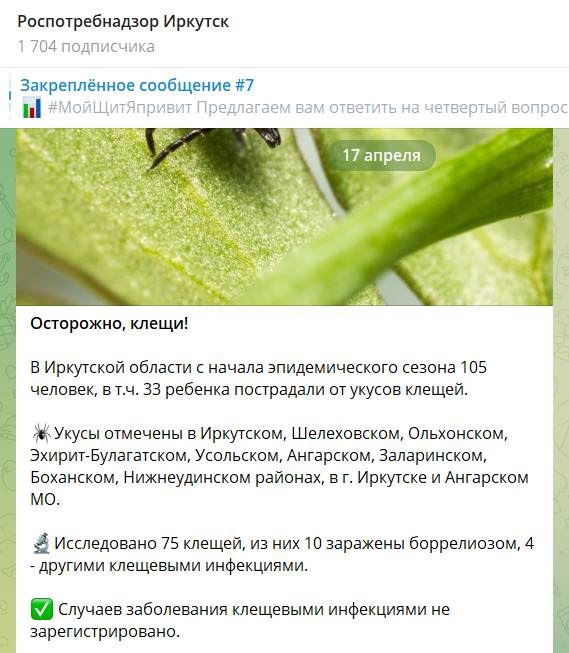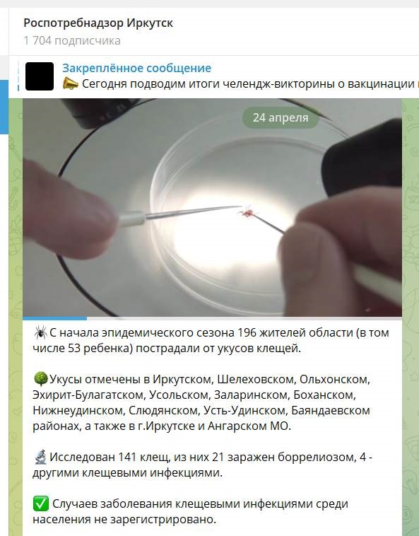 17 апреля написали, что с начала эпидемиологического сезона исследовано 75 клещей, из которых 10 были заражены иксодовым клещевым боррелиозом, четыре – «другими клещевыми инфекциями».